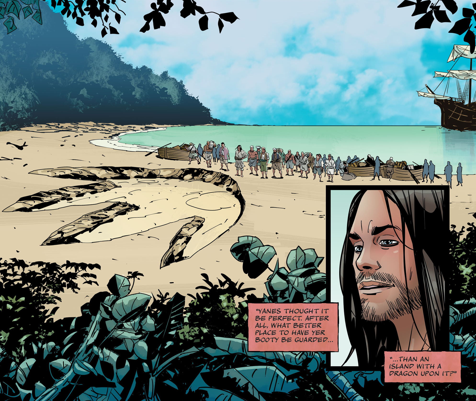 - Pirates Antonio Botafoc and Martin Yanes attempt to rob a ship off the coast of Cartagena. Botafoc is captured, but Yanes' ship escapes with the stolen treasure, encounters a storm, and then comes to the unexplored Monster Island. Impressed by the enormous creatures inhabiting it, Yanes hides the treasure in Godzilla's cave. (Godzilla: Here There Be Dragons)
