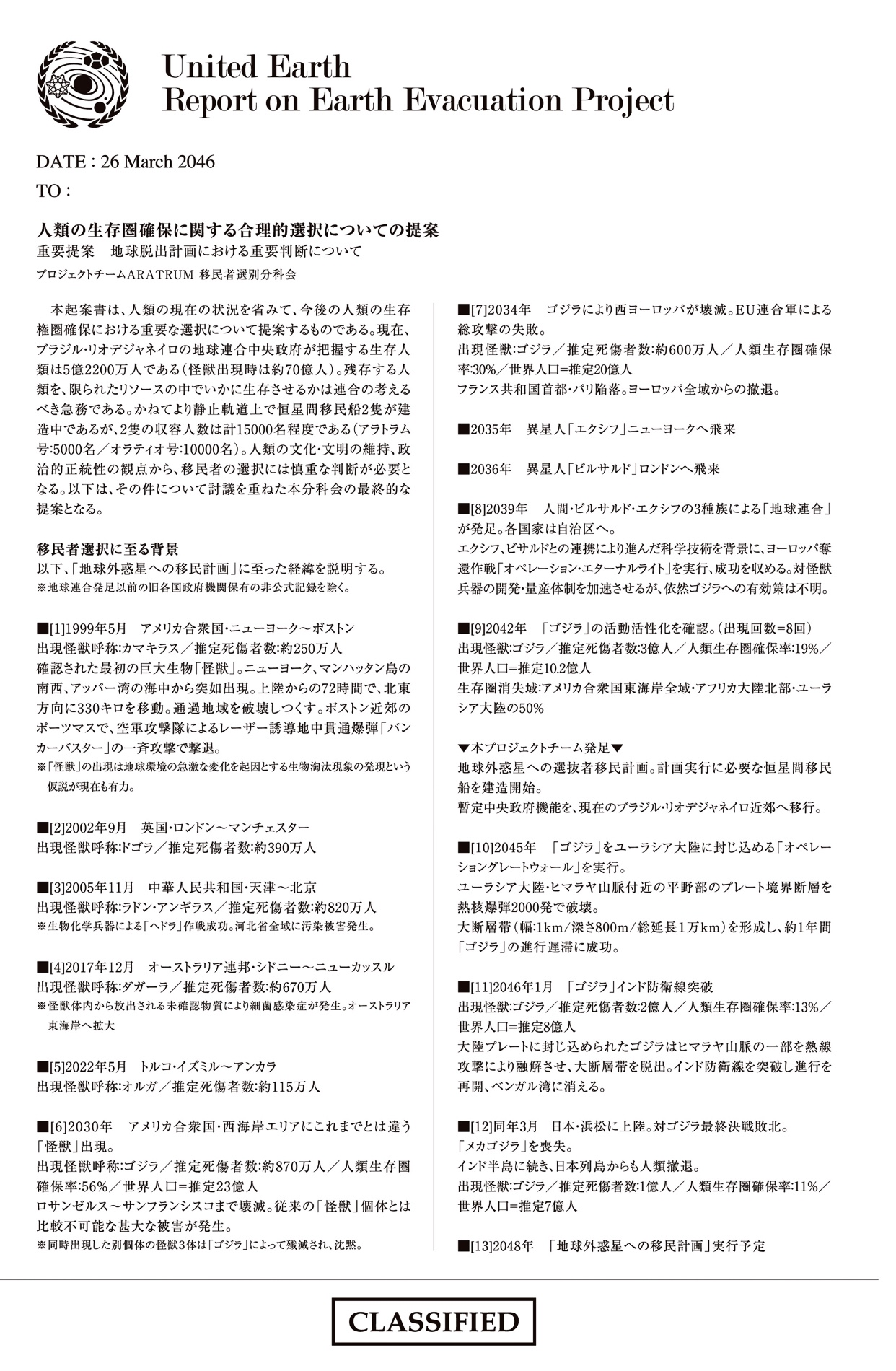 - "Operation: Eternal Light" for developing weapons against giant monsters using advanced technology is carried out by humans, Exif and Bilusaludo in Europe. (GODZILLA: Monster Apocalypse)[1]