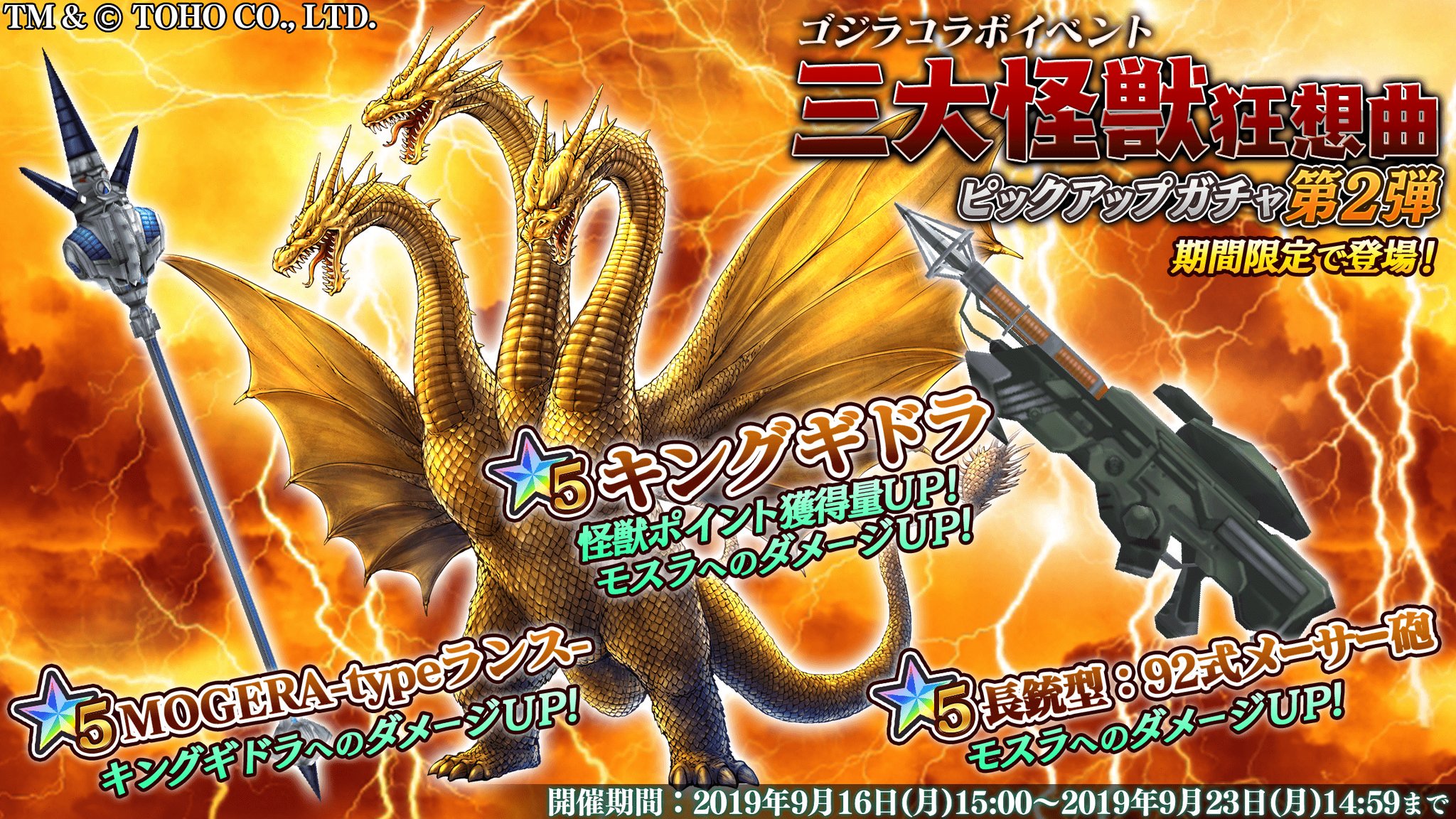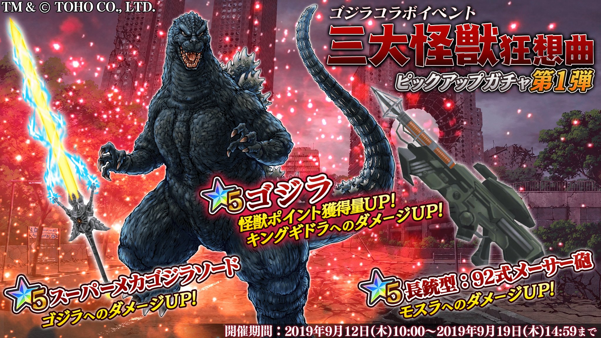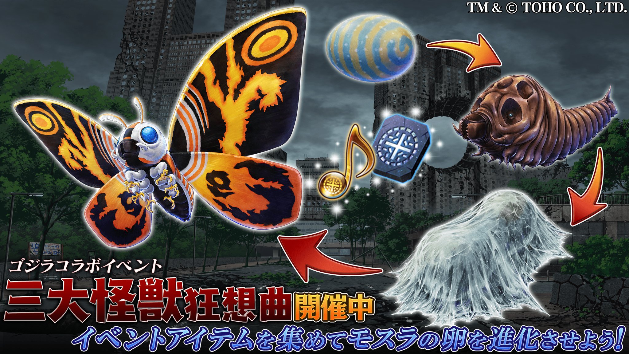 As part of this collaboration event, players can encounter Godzilla, Mothra, and King Ghidorah as enemies in the game. Once the monsters are defeated, they are added as potential allies to the player who can be leveled up and used in combat. Mothra in particular can be leveled-up using in-game items called "Mothra's Songs." Each monster has several unique attacks, including a particularly powerful special attack. In addition, special weapons designed to combat each monster are included in the game. The Super Mechagodzilla Sword is useful against Godzilla, the MOGUERA-type Lance against Ghidorah, and the Type 92 Maser Gun against Mothra.