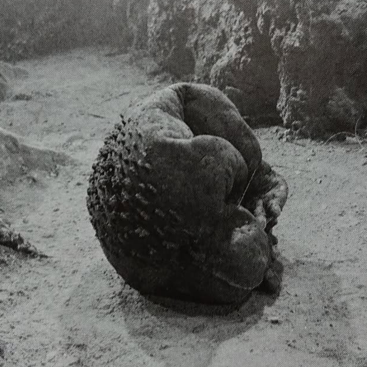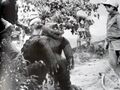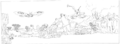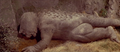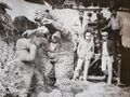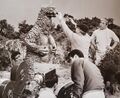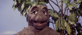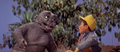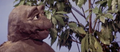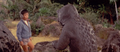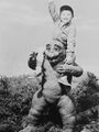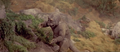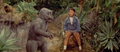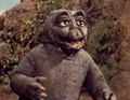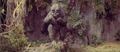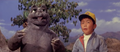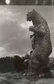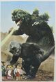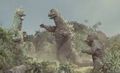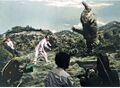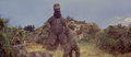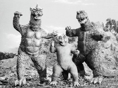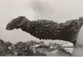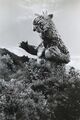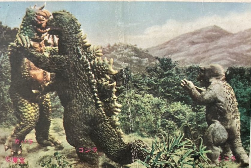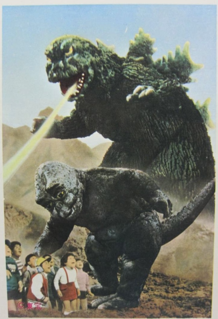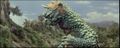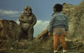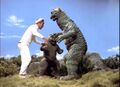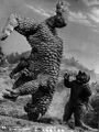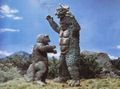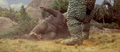 Minilla jumps down from a cliff to throw Gabara off his feet