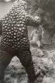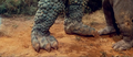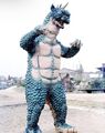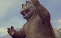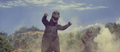 Godzilla grabs Gabara's arm and throws him onto the ground