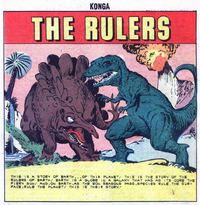 An Allosaurus is depicted on the cover of "The Rulers" story attacking a Stegosaurus, and is shown in the comic itself growling at another, larger theropod. The same dinosaur is shown in the same picture with animals from the late Cretaceous period.