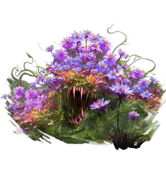 Beautiful flowers cover the ground in layers on top of leafy tresses, creating what looks like a soft patch for animals to rest upon. The flowering buds emit an irresistible fragrance that invites closer inspection. But woe to any creature foolish enough to stop and savor the aroma, for this idyllic field of flowers is, in fact, the mouth and stomach of the Alluring Bulb, a notorious Skull Island ambush predator.
