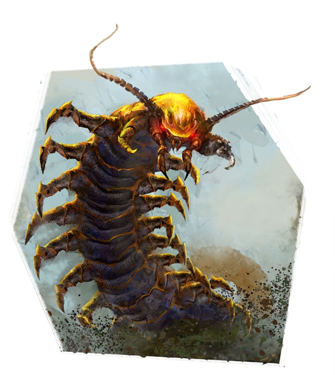 Amberpedes are a centipede superspecies with a body structure resembling that of an Arizona desert centipede without antennae. The creatures have an orange underbelly, a black exoskeleton, and a pair of reddish legs per body segment. The Amberpede in Skull Island has four red eyes, while in the Kong: Skull Island - Creature Codex they are shown to only have two. The Creature Codex also depicts them with a black underbelly, a golden exoskeleton, and antennae. The plates on their bodies are stated to be made of a semi-translucent gemlike substance that looks like amber. Amberpedes have six front forelimbs and two-foot-long sharp mandibles which are all tipped with durable dark chitin.[1]