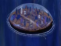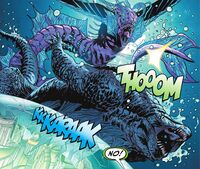 After the Toyman used the Dreamstone to teleport the Titans to his reality, Tiamat attacked the great city of Atlantis. Aquaman and his fellow Atlanteans attempted to repel the beast to no avail, at which point he contacted the Justice League for assistance. Godzilla soon arrived and engaged Tiamat just outside of the city, placing Atlantis and its people in grave danger. After Godzilla was knocked into the city and pierced its dome with his dorsal fins, Aquaman decided to summon the Kraken - the protector of Atlantis. Though the Kraken tried to lead the fight away from the city, Tiamat and Godzilla continued to damage the dome, leaving it with several giant holes that Hal Jordan attempted to seal. Though the strain eventually proved too much for Hal to bear, his fellow Green Lanterns soon arrived to ensure that the city would remain sealed long enough for the Atlanteans to fix the damage caused by the monsters.