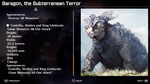 - Baragon is featured in concept art published in The Art of Godzilla: King of the Monsters, along with other established kaiju such as Anguirus and Gamera.[29] In an interview with the Los Angeles Times, director Michael Dougherty said, "We had thought about using some additional Toho creatures to give them some cameos but every Toho creature comes with a price tag. It was a choice to either shell out more money simply for the rights for these creatures to show up on screen for a few seconds, or embrace the opportunity and the challenge to create new creatures."[30]