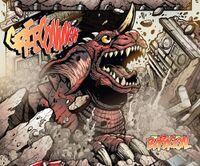 Baragon is portrayed in various different lights in the multiple comics made by IDW Publishing. In Godzilla: Rulers of Earth, he is portrayed as rather destructive, attacking Paris for no apparent reason, and immediately attacking Mechagodzilla upon the mech's arrival. While he was corralled on Monster Island, Baragon lived in relative peace with the other kaiju, although he had brawled with Kumonga and Sanda at one point. When Monster Island was under siege by the Trilopods, Baragon worked together with his fellow Earth kaiju until the aliens defeated and captured him, doing so again when King Caesar freed him for the final battle in Los Angeles. After Godzilla physically exhausted himself killing Magita, Baragon was among the kaiju who looked at him in concern, and later followed him out to sea after the reptilian had recovered. In Godzilla: Rage Across Time, Baragon was an ally of Varan who ferociously battled both Godzilla and Anguirus, showing no regard for the smaller dinosaurs caught up in the great battle. In "Ain't No Place For an Angel", Baragon is more akin to his Frankenstein vs. Baragon portrayal, an aggressive monster used by an outlaw as a distraction to steal gold, attacking Mothra upon bursting from the ground. In Godzilla vs. The Mighty Morphin Power Rangers II, Baragon is a heroic monster who allies with Godzilla, the Kaiju Power Rangers, and their other allies to battle the Kaiju Psycho Rangers. In Mothra: Queen of the Monsters, Baragon appeared eager to fight, only to lick Mothra Gemini's face and nuzzle up to her instead.
