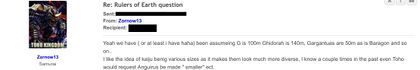 - ↑ Many sources do not make any distinction between the first and second generation Baragon, and list them both as being 25 meters tall.
