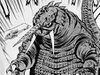 Wrapped in bandages, Baragon tells Godzilla that the sword, shield, and armor of the great hero have fallen somewhere on Earth.