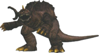 Baragon is a quadrupedal, mammal-like reptilian creature with reddish-brown skin, a single large horn on his forehead which is followed by several backwardly-curved spikes on the back of his head, and large floppy ears. Baragon typically has canine-like facial features that look fairly similar to those of a Bulldog or Pug, with large, expressive eyes and a short muzzle. Baragon also has two sets of segmented, plate-like structures on his back and tail.