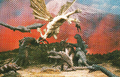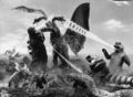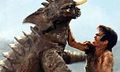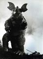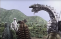 Baragon, now on the same side as the other Godzilla Island monsters, helps Godzilla battle Mecha-King Ghidorah