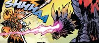 In episode 166 of Godzilla Island, "Baby's Brain Breaks Free," Battra briefly keeps Godzilla at bay with an orange-brown powder released from his wings. Battra also appears to have this ability in the PlayStation 2 version of Godzilla: Unleashed, but instead it works more like an energy shield, encasing his whole body with a red barrier shaped like him.
