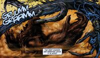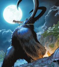 Behemoth is a mammalian creature resembling a giant sloth with a mammoth head. He knuckle-walks like an ape with his long and muscular forelimbs, which are larger than his hind legs. Mammoth-like tusks jut downward from his cheeks and a stubby trunk-like structure covers his mouth region. Behemoth is covered in light brown fur and appears to have greenish vines or algae growing on his otherwise gray tusks. Behemoth possesses a row of bumpy triangular spikes running along his back, which Monarch describes as being made of "unbreakable granite fortified with metal and ore."[1] He has sloth-like claws and elephantine feet. His eyes are pale grey.