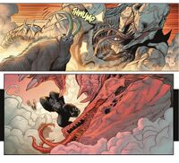 After most of Behemoth's tusk is broken off by Amhuluk in Godzilla Dominion, a subsequent panel shows it to be longer than when it was broken. Artist Drew Edward Johnson later clarified that he intended this to be the tusk regenerating,[8] elaborating, "I figured if the tusks are his main weapon, they should grow back quickly".[9] This regeneration was finally shown explicitly in Monsterverse Declassified, with Behemoth's tusk beginning to reform shortly after he awakens from his defeat by Amhuluk. It continues growing over the course of the day until it is fully healed by the end of the comic.