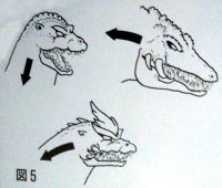 In her second form, Biollante's Godzilla genes take over and her body becomes an abomination of biological science. Biollante's second form has a head similar to that of a mosasaur or crocodile and a tongueless maw with a multitude of knife-like teeth, even on the interior lining. In addition, six large tusks, three on each side, protrude from the fulcrum-region of her mouth. Large numbers of vines and tendrils are a primary feature of Biollante in both forms. Some vines end in sharp, spear-like ends, while others sport small, sharp-toothed mouths. In her second form, Biollante uses her four main tendrils to lunge forward and "run," gathering speed as she does so. What appears to be meaty flesh is visible underneath the tangled mess of vines and plant tissue on Biollante's chest. The fleshy surface is yellow and red-orange and has many wrinkles and lines, resembling a brain.