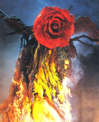 Hoping to steal Shiragami's research on the ANEB, Bio-Major agents John Lee and Michel Low, along with Saradian agent SSS9, raided Shiragami's laboratory one night. While inside, they were attacked by the rose, which had been mutated into a sentient and mobile creature by the Godzilla cells. The rose strangled Low to death, while Lee and SSS9 were barely able to escape with their lives. The rose then broke out of the laboratory and took root in Lake Ashi. The next morning, Shiragami traveled to the lake to see the creature, which he named "Biollante." Miki Saegusa reported that she could sense a human spirit within the bizarre lifeform, calling out faintly. Shiragami realized that this spirit was none other than the consciousness of his daughter. Biollante began crying out, which attracted the attention of Godzilla, who had just been unleashed from his volcanic prison in Mount Mihara by a Bio-Major bomb. Godzilla reached Lake Ashi by nightfall, where he came face to face with Biollante. Shiragami suggested it was possible that Godzilla came all this way to see Biollante because he sensed they were made from the same cells. As Shiragami put it, they were more than just brother and sister, but the same creature, only with Godzilla being an animal, and Biollante a plant. As if panicking, Biollante attacked Godzilla with her vines, wrapping them around his arm and neck. Godzilla fought back, blasting Biollante with his atomic breath. Godzilla's atomic breath had an adverse effect on Biollante's cell division, causing her nucleus to hemorrhage and her petals to fall off. Biollante tried to hold Godzilla at bay by building a wall with her vines, but Godzilla destroyed it with his atomic breath. Godzilla blasted Biollante with his atomic breath again, causing her to burst into flames. Rather than die, Biollante broke apart into glowing spores of energy and floated into the sky. Shiragami remarked that Biollante was truly immortal and incapable of dying after all. His enemy gone, Godzilla left the area and continued menacing Japan.