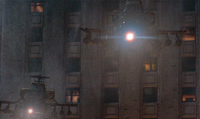 As Godzilla fled the military in Manhattan, three AH-64 Apaches were ordered to follow and destroy the monster. Godzilla roared as it tried escaping the helicopters, who were following closely behind. When Godzilla jumped atop a tall building, one of the helicopters fired its heat-seeking missiles, which failed to lock onto the monster and hit the Chrysler Building instead, destroying its spire. The pilots continued to follow Godzilla to a ruined building, where they assumed that it was hiding. They fired the Apaches' guns and missiles, as the roar of the monster seemed to come from the explosions. Unexpectedly, Godzilla appeared behind them and immediately destroyed two helicopters with its claws. Godzilla then started to chase the last helicopter through the city streets. When Godzilla seemed to have disappeared, and the last pilot thought that he had outrun it, the monster swiftly rose from below and crushed the last helicopter with a single bite.