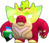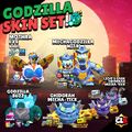 A skin for the brawler Buzz in the game. He has dorsal fins like Godzilla on his back, translucent shades, and a boat in place of his torpedo buoy. The base skin gives him a dark green coloring with a gray chest, dorsal fins glowing blue, and blue shades. Two variants were available as well: the Red Godzilla Buzz Skin (with yellow dorsal fins and shades) and the Black Godzilla Buzz Skin (with orange dorsal plates and shades). Buzz's standard attack is adjusted to resemble Godzilla's signature atomic breath. His Hypercharge transforms him into Godzilla, increasing his size in the process. These skins could be acquired for free from Monster Eggs during the season.