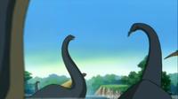 While grazing in a narrow valley, a herd of Brontosauruses were happened upon by a group of human filmmakers just as a pack of Venatosauruses made their move. Sensing the danger, the sauropods began to flee. Shaking the ground with their steps, they ran toward the humans as the predators snaked in between and around them. Their thundering footsteps caused small rockslides off the valley walls, but when one man turned to shoot at a Venatosaurus, he missed and struck the lead Brontosaurus, who toppled over and tripped all of the stampeding dinosaurs behind it. The wall of sauropods were crawled over and preyed upon by the Venatosauruses before they moved on to the running humans.
