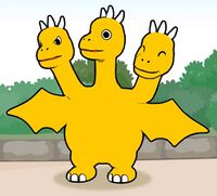 Chibi Ghidorah (ちびギドラ Chibi Gidora) is a juvenile kaiju who first appeared in the 2018 children's book Do Your Best, Chibi Godzilla. A three-headed dragon with the talent to sing, Chibi Ghidorah is a close friend of Chibi Godzilla and his other friends. He is featured in all three Chibi Godzilla books which have been published so far, as well as the web anime I'm Home! Chibi Godzilla and the TV anime series Chibi Godzilla Raids Again.