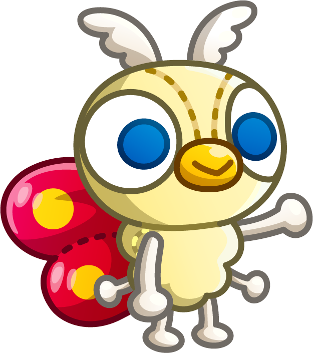 Chibi Mothra is a cream color while her wings are red with yellow spots. She has three pairs of legs, two feathery white antennae, big round eyes with blue pupils, and a yellow beak.