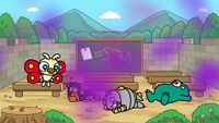 Chibi Mothra joined the Shobijin and several others on another trip to Chibi Biollante's bar, where Chibi Biollante informed Chibi Mechagodzilla that the establishment offered karaoke. The Shobijin pushed for Chibi Mothra to sing "Mothra's Song", though the Shobijin ultimately took over before she even had a chance to begin, surprising the other chibi monsters, including Chibi Mothra herself. Chibi Biollante then revealed the karaoke machine's scoring system, which awarded the Shobijin an average score and suggested that they needed to work on their synchronization. The Shobijin were infuriated by this criticism, though they attempted to pass off their rage as Chibi Mothra's. Later, Chibi Biollante recommended that they all sing a song together, with Chibi Godzilla selecting "Godzilla's Theme". Because the song had no lyrics, the group could only hum along, much to Chibi Mechagodzilla's annoyance. However, the group ultimately earned a perfect score on the karaoke machine's scoring system.