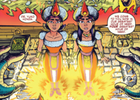 In the Rebirth of Mothra trilogy, Mothra's priestesses were known as the Elias, individually named Moll (モル,   Moru) and Lora (ロラ,   Rora). Unlike earlier incarnations, they were not mind-linked twins but individual persons. They frequently found themselves in conflict with their human-hating sister, Belvera (ベルベラ,   Berubera). In addition to accompanying Mothra and Mothra Leo, the Elias utilized the tiny Fairy Mothra as their steed while Belvera used Garugaru.