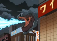 Cyber Godzilla is armed with an atomic breath which is blue in color (an obvious reference to the Japanese Godzilla) as opposed to his son, whose atomic breath is green.