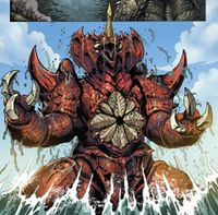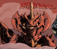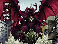 Destoroyah was a biological weapon created by the undersea-dwelling Devonian aliens to aid in their war against humanity. A Juvenile Destoroyah's leg fell off of Zilla in Honolulu after his battle with Godzilla, implying Zilla had a previous encounter with the creatures. The Devonians released numerous Juvenile Destoroyahs in San Diego as a diversion while the Cryog stole a sample of Godzilla's skin from a nearby facility. Swarming a nearby comic convention, the Destoroyahs attacked and killed numerous civilians before moving out into the city, where CKR forces attempted to engage them. After the creatures proved immune to conventional firepower, Steven Woods and his fellow CKR soldiers attempted to use a new weapon on the monsters called the Ice Box - however, they initially struggled to turn the weapon on, forcing Woods to fend off one of the creatures until the device was activated and froze the attacking Destoroyah. Once a few of the creatures had been frozen, the remaining Destoroyahs fled back to the sea, having served their purpose. Godzilla later appeared in the area and was suddenly attacked by a larger Destoroyah underwater, who left a massive gash in Godzilla's chest that caused him to collapse upon making landfall. There, Godzilla came under assault from numerous Juvenile Destoroyahs, but the King of the Monsters recovered and used his nuclear pulse to incinerate them. In response, the giant, Perfect Form Destoroyah rose out of the ocean to confront Godzilla, with the two kaiju exchanging beam fire before Destoroyah charged at Godzilla and grabbed him by the neck. After throwing Godzilla to the ground, Destoroyah took flight to engage a fleet of jets that had fired upon him. Shortly thereafter, however, he was knocked out of the sky by Mothra, who dodged his subsequent beam attacks until Destoroyah managed to grab her with his tail. Before he could kill her, Godzilla returned, having recovered from his injuries by feeding on an aircraft carrier's reactor, and attacked Destoroyah with his atomic breath. Mothra and Godzilla then joined forces against the monster, with Mothra striking Destoroyah's head while Godzilla slammed him to the ground. Mothra closed in and used her poisonous scales on Destoroyah, though he retaliated by using his Horn Katana on her, severely wounding her in front of her larvae. With Mothra dispatched, Destoroyah engaged Godzilla with his horn, but Godzilla caught it and snapped it off. After Godzilla further wounded Destoroyah with his atomic breath, the Mothra larvae encased him within a cocoon, at which point Destoroyah broke off into his smaller Aggregate Forms in an attempt to flee. However, Godzilla incinerated most of them with his atomic breath, leaving only a few to escape back into the ocean.