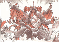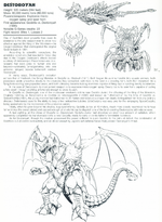 Another route for the concept was taken, and it was decided to change the creature's design to being crustacean-like in appearance, with its name changed to "Destoroyah." Concept artist Minoru Yoshida was the main driving force behind designing Destoroyah, having introduced the crustacean theme during the later stages of Barubaroi and creating the Juvenile, Aggregate, and Flying Forms. However, the design for Destoroyah's Perfect Form is credited to Hideo Okamoto.[7] While the suit more closely resembles some of Yoshida's concepts, the original decided design for the Perfect Form still appears on the illustrated poster by Noriyoshi Ohrai.[8] Devilman, the titular character from Go Nagai's manga series Devilman, was an influence on Destoroyah's design aesthetic.[9] This influence was initially introduced in Minoru Yoshida's crustacean-themed concepts for Barubaroi before being carried over later on into Destoroyah's final designs.