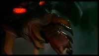 Destoroyah's first form, the Micro Form, is never actually seen in the film, though artwork of it gives it a trilobite-like appearance with prominent "horns" at the sides of its body.[2] His second form is the Crawl Form, which is seen in the film and often confused with the Micro Form. It resembles a red miniature horseshoe crab, with two large spikes on its body, eight small legs, a pointed tail, and two prominent mandibles.