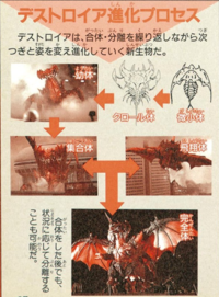 Destoroyah's forms are denoted as Micro Form (微小体 Bishō-tai), Crawl Form (クロール体 Kurōru-tai), Juvenile Form (幼体 Yō-tai), Aggregate Form (集合体 Shūgō-tai) or Intermediate Form (中間体 Chūkan-tai), Flying Form (飛行体 Hikō-tai), and Perfect Form (完全体 Kanzen-tai).