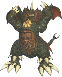 After Torema returned to the cave and helped Godzilla defeat Proto-Moguera and trick it into helping them escape the cave, Megalon and Destoroyah were ready to attack the pair as they escaped and Destoroyah blasted Godzilla with his Oxygen Destroyer Ray before the two of them engaged him in physical combat. Destoroyah continued to attack Godzilla as Megalon dealt with Torema in the Panna Torte with a bomb attack, only briefly stopping to beat the malfunctioning Proto-Moguera into the ground after it interrupted the battle. They were however interrupted once again by the arrival of Gigan, who shocked everyone by knocking down Megalon and then shooting Destoroyah out of the sky with a laser as he tried to escape, with Godzilla tail-whipping Destoroyah into unconsciousness. The two then dragged Megalon and Destoroyah into the cave and caused a cave-in of their own with their beam attacks, trapping the evil monsters.
