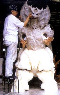 Destoroyah was modeled by Shinichi Wakasa's company MONSTERS. Due to the lengthy design process, the filmmakers had only a short period of 40 days to construct the Aggregate Form suit, the Flying Form prop, and Perfect Form suit. As such a staff of 22 individuals was collected for modeling Destoroyah.[7] The Juvenile and Aggregate Destoroyah suits were built based on the same clay prototype.[7] The various claws and appendages of the Juvenile and Aggregate Forms were manipulated either remotely or with wires.[10] In addition to the Juvenile and Aggregate suits, animatronics with built-in mechanisms and an animatronic head were also created.[10] The full animatronics were self-propelled with a wheel system built in under the body.[10] For distant shots of the Juvenile Forms, Bandai vinyl figures were utilized.[11] For the scene where Godzilla is swarmed by numerous Aggregate Forms, only a single model was used and was composited into the shot numerous times to create the illusion that there were several Aggregates.[11]
