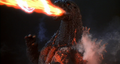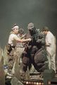 Kenpachiro Satsuma collapses from smoke inhalation during filming. The wires which supply electricity to the suit's LEDs can be seen to the bottom right, connected to the suit's tail.
