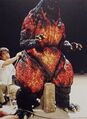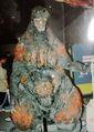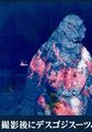 As with the MogeGoji and the previous designs, an animatronic was also made for the DesuGoji, used in close-ups of Godzilla's battle with the Super X3, the effect of his face freezing and when he attempts to breathe life into Godzilla Junior. It also is very similar to the suit, only featuring slightly larger eyes. A small model was made and used for the shot of Godzilla getting dragged by Destoroyah near the Haneda Airport. A set of dorsal fins and a Godzilla head were made out of wax, and were used to portray the effects of Godzilla's skin melting and exposing his skeleton. A computer generated model was made and used for Godzilla's meltdown, noticeably different in proportions to the suit.