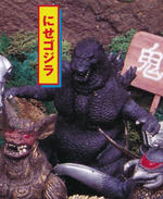 In addition to the MegaroGoji suit used to portray Godzilla himself in Godzilla vs. Mechagodzilla, Fake Godzilla was portrayed with a promotional Godzilla suit that looked noticeably different.[9] Director of special effects Teruyoshi Nakano has stated that switching the suits used for Fake Godzilla between scenes was done intentionally, as was the difference between the two suits' faces. In his words, he wanted child audiences to remark, "Hey, is that different?" Elaborating: "An imposter appears first, and at that point, the regular suit is used, but after that, the suit that appears is purposely different-looking."[10] Additional footage of Godzilla and Fake Godzilla's confrontation and daytime footage of Fake Godzilla transforming into Mechagodzilla in Okinawa was filmed and included in the film's Japanese theatrical trailer, but does not appear anywhere in the film itself.[11]