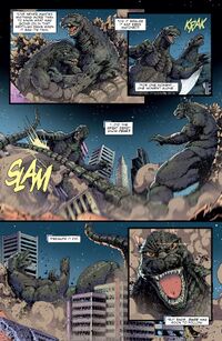 When Godzilla attacked a city, another Godzilla appeared to fight him. However, the impostor's skin was soon melted away with atomic breath, revealing Mechagodzilla beneath.