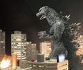 Following his victory over Hedorah, Godzilla confronts Gigan, who appears in a blue flash over Tokyo. After the cyborg lands, Godzilla opens the fight with a blast of atomic breath, but Gigan shields his face with his Hammer Hands and returns fire with his forehead laser. Godzilla stumbles backwards before charging Gigan as he continues firing lasers. Gigan slashes Godzilla on the cheek, leaving a small wound. Godzilla continues fighting in close quarters, now taking care to avoid Gigan's Hammer Hands; one errant swing slices the top off a radio tower. Godzilla aims a punch at Gigan's forehead laser, breaking it. Enraged, Gigan activates his buzz saw, cutting a deep wound into Godzilla's chest. He collapses onto an overpass, dazed. Gigan approaches and prepares to finish him off, but Godzilla catches his Hammer Hands mid-swing and rises to his feet. Keeping his grip on the blades, Godzilla breathes atomic fire into Gigan's face; the cyborg falls backwards and explodes. Godzilla lets loose a long victory roar.