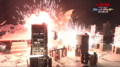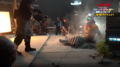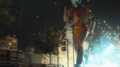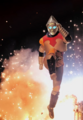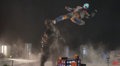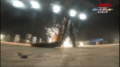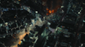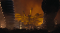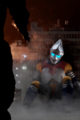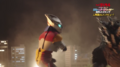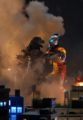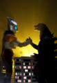 Jet Jaguar swings Godzilla around into a building and tries to punch him, but Godzilla evades and positions himself behind his adversary. Jet Jaguar turns in time to see the King of the Monsters charging his atomic breath. Jet Jaguar runs in the opposite direction, taking the ray in the back and stumbling to the ground. As he begins to rise, Godzilla kicks him in the chest and stomps towards him. He grabs the robot by the head and lifts him into the air before throwing him away into a building. As Jet Jaguar catches fire in multiple places, Godzilla stands over him, charging his atomic breath to deliver the finishing blow. Suddenly, a bolt of electricity strikes Godzilla in the face, sending him to the ground. Jet Jaguar looks to the sky to see King Ghidorah appear in a massive fireball, cackling as he lands in the city. He begins spewing gravity beams throughout the cityscape, destroying many of the structures. Seeing this, Jet Jaguar gets to his feet and walks over to the struggling Godzilla, grabbing the monster's hand and lifting him to his feet. Godzilla gives a small roar to his new ally and Jet Jaguar returns a thumbs up. The two turn to face the golden invader, and Godzilla roars.