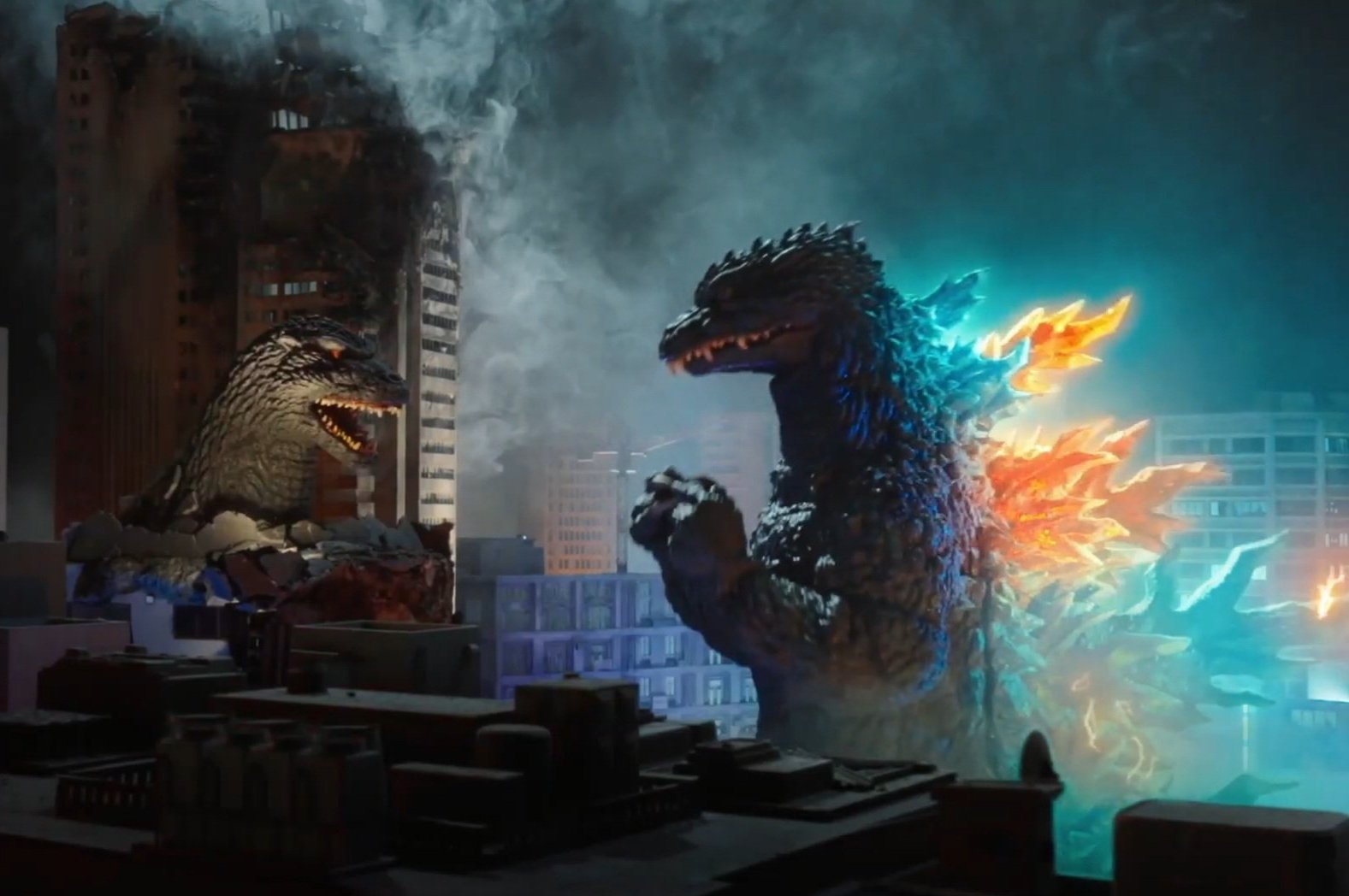 Two JSDF soldiers in a Tokyo subway discuss how Godzilla's temperature is climbing before they evacuate. The monster's foot crashes through the station moments later. Helicopters fire missiles and machine guns at Godzilla as he retaliates with atomic breath, appearing staggered by their attacks. Pursuing one helicopter, he enters Shinjuku's Kabukicho district, his temperature reaching 490°C. His next blast of atomic breath is tinged with orange, but misses the helicopter. Godzilla stops in front of the heavily-damaged Shinjuku Toho Building, roaring at a sculpture of his head resting at nearly eye level. He shoots down the first helicopter to resume firing at him, but the second knocks him over with a missile barrage. Smoke obscures the monster, but as his body temperature exceeds 800°C, he fires a powerful heat ray to annihilate the helicopter and devastate the surrounding area. He rises with yellow-orange patches throughout his skin, having becoming Burning Godzilla. A soldier stares at him in awe before hearing the arrival of a new monster. Godzilla stares down his next opponent and roars a challenge.