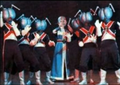In Assault! Human!!, the Flashers wear black jumpsuits with white gloves and boots. They all wear fly head-like helmets with silver antlers pointing to the sides that cover most of their heads except for their mouths and chins. The color of their heads depends on what kind of Flasher they are. There are regular flashers which have blue heads, Flasher Red Eyes which have red heads, Flasher Black Masks which have black heads, and Flasher Pink Masks which have pink heads. The regular flashers also have different colored straps spanning across their chests. The color of the strap also depends on what kind of Flasher they are.
