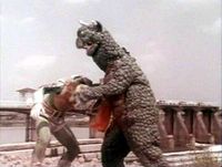 Gabara was a mutated bullfrog, and did battle with the hero Godman. After the two had a long scuffle, Gabara pinned Godman to the ground and get a couple of hits on him. Godman got back up, and pulled out his God-Crush. Gabara backed up, but Godman repeatedly hit Gabara and tried choking him using his God-Crush. Gabara pushed him back, but Godman felled him and continued whacking him with his God-Crush. Godman then traded the God-Crush for his God-Discs. He repeatedly threw them at Gabara and they exploded on impact, causing the kaiju to retreat.