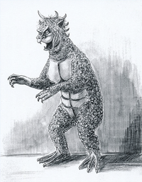 The audio commentary for Classic Media's 2008 DVD release of All Monsters Attack humorously compares Gabara to a bipedal cat with car engine problems. Although he is said to be based on a toad,[9] Gabara is very similar to - and more than likely partially based on - the oni of Japanese mythology and folklore. His costume design is very reminiscent of these demonic ogre or troll-like beings, further mixing the turquoise scales of a reptile with orange, cat-like fur and distinctly mammalian facial features. He also has three horns on his head, again much like the oni, whose horns varied between one to three on average. Gabara's ability to electrocute things on contact is possibly a reference to oni lore, as they too were sometimes associated with the natural forces of lighting and thunder.