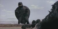 Gamera came to the rescue to save a pair of children from the alien invader known as Zigra and his brainwashed human slave Lora Lee. After Gamera saved the children, Zigra took matters into his own hands and revealed himself as a kaiju-sized fish creature. Zigra engaged Gamera in battle underwater, overpowering him with his superiority in underwater combat. Gamera was revived by a bolt of lightning and attacked Zigra again, throwing him onto land, where he was rendered helpless. Gamera used a rock to play his theme song on Zigra's dorsal fin like a xylophone, then killed Zigra by burning him alive with his fire breath.