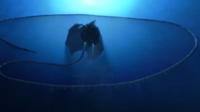 As Zigra raced towards the boat transporting the kids, Emiko, and Tazaki, Gamera intercepted him from below, grabbing him and biting into his neck before plunging back into the ocean. Gamera continued dragging Zigra into the depths, biting deeper into his neck and smashing him against the ocean floor. The guardian monster immediately turned around and headed towards the surface, spinning with Zigra as he kicked his plastron. Zigra utilized his elastic tail to wrap around Gamera's neck, pulling them apart. Gamera chased after Zigra as he fled, with Zigra circling around with supercavitation and turning the tables, beginning to pursue Gamera while firing his liquid shot repeatedly. These hit Gamera's shell, with no noticeable damage being dealt, and Gamera turned around with Zigra turning in conjunction to continue the chase. Gamera dodged several more liquid shots before finally being hit in the plastron, causing him to cry out in pain. As the humans escaped in a submarine attached to the now-destroyed ship, Gamera continued being followed by Zigra, turning around to face and charge at him. Gamera began charging his electricity as they charged at each other, discharging it in a massive electrical shockwave. Gamera began sinking and Zigra was rendered disoriented for some time as it swam off to continue searching for the children.