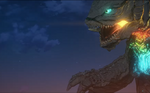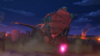 As Boco ran as far as he could to lure S-Gyaos away and buy Gamera time to regain his strength, the guardian monster detected that Boco was in danger. Boco was trapped on a cliff as S-Gyaos approaches, but Gamera, having gotten up before fully recovering, blasted S-Gyaos with a fireball, knocking it over and away from the child. Gamera roared as he rose over the hill, and continued rapidly shooting fireballs against his opponent's hide. The monsters roared at each other and S-Gyaos charged, with Gamera hitting it away, grabbing its face, and smashing it into the ground with his remaining arm. S-Gyaos backed up a little bit and fired its Super Sonic Scalpel several times, but Gamera blocked them with his shell and armored forearm as he charged his electricity. Gamera discharged the power into an electrical shockwave, stunning S-Gyaos and causing it to fall over backwards into the water. Gamera began charging another large fireball, but S-Gyaos interrupted the fire with his extendable tongue, plunging it down Gamera's throat. Gamera attempted to pull the tongue out of his mouth, but weakened as S-Gyaos injecting RNA viruses into him. Suddenly, Commander Muneatsu Sasaki began firing at the winged monster's face and open mouth with his tank, causing S-Gyaos to reel back but not retract its tongue. Several U.S. aircraft arrived and bombarded the monster's back, with a final shot in the mouth from Sasaki causing it to release Gamera and pull back its tongue. Gamera roared and flew into the air, beginning to spin in multiple directions, creating a barrier with his jets. As Gamera lowered towards it, S-Gyaos fired several Super Sonic Scalpels, but these all deflected off against the barrier, allowing Gamera to slice into S-Gyaos, killing it and landing on its body. As Gamera emerged from his shell and stood up, the Foundation leaders activated the RNA viruses S-Gyaos had injected into him, restructuring his genetic code as it was originally intended. This caused Gamera's skin to darken from a green to a black, and his eyes turned from bright green and blue to orange and red. Gamera roared and began to slowly walk towards Boco, who screamed to Gamera that he was different from the other kaiju, which caused him to hesitate before roaring and looking at Boco. Gamera's head suddenly dropped, and his eyes changed back to their green and blue coloring. Gamera looked back up as his chest crackled with energy, and he slowly turned away from Boco, who screamed for him to stop. Gamera tilted his head back to look straight towards the sky and at the moon, and energy gathered around him and in his mouth. The energy concentrated to a singular point in Gamera's mouth before exploding out into a beam, completely eviscerating the Foundation's Moon base and blasting through the back of the Moon. Gamera stood still in the same position for a few moments before his body disintegrated, leaving behind a bright-blue glowing egg.