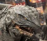 - The depiction of Gamera's neck and postoculars[28] glowing when he uses fireballs bears some resemblance to an unused idea of Kazunori Ito and Shinji Higuchi's for Gamera the Guardian of the Universe (1995), where Gamera would split his mouth open and emit lights from his neck and postoculars when using Plasma Fireballs.[29][30] This is also similar to the sequence of Godzilla's atomic breath by Higuchi in Shin Godzilla (2016). Moreover, Gamera's chest also glows,[10] similar to Toto when using the Toto Impact in Gamera the Brave.