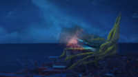 As Zigra closed in on the electrical tower, Gamera erupted from the sea, roaring. The turtle monster crackled with electricity, and Zigra began to charge up his own energy attack while slowly extending his tail towards Gamera. Zigra suddenly leapt up, turned around, and fired his liquid shot while launching his tail at Gamera, stabbing him in the shoulder. Zigra glided towards him while firing another blast, but Gamera ducked into the water to counter it before rising back up and shooting a fireball, striking Zigra in the chest. Zigra crashed, screeched, and flailed for a few seconds before dying and burning out. Gamera turned, roared in victory, and swam off into the ocean.