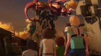 As Guiron looked into the building at Boco and Brody, the kaiju suddenly turned his head and leaped away just in time to dodge a fireball. Suddenly a second fireball blasted through the floating mine facility, striking Guiron in the blade and flipping him into the air as Gamera flew up from the ocean. Guiron landed on his feet has Gamera touched down on the ground, and the kaiju turned to face each other, roaring. With another roar, the monsters charged each other, with Gamera smacking away the blade only for Guiron to counterattack with a slice through his thigh. Gamera shot another fireball, only for Guiron to dodge in a front flip, spinning twice to slice into Gamera's arm as the turtle monster blocked with it. Gamera charged again, hitting Gurion's blade with his claws and dodging each time as his opponent tried to bring it down on him. Gamera fired two more blasts, with Guiron jumping aside from the first and leaping over Gamera to avoid the second. Gamera finally landed a shot as Guiron touched down, but it seemed ineffective against the bladed kaiju's durable back. As Tazaki freed Emiko from rubble, Gamera continued to shoot fireballs at Guiron, with these shots being dodged each time. Guiron leaped over Gamera again, and his back blades began to crackle with bright blue electricity. His middle row of back blades locked into position and he straightened his back and started launching electrically-charged blades at Gamera, causing small cuts where they bounced off and sliced into his body, almost hitting Boco and Brody. As Guiron slowly marched forward while firing the blades, Gamera continued protecting the children. Gamera fired another flame blast at Guiron, but he leapt into the air yet again and fires another blade, hitting Gamera in the eye. Yet again, Gamera shot a fireball only for Guiron to dodge, flipping toward him and slashing through Gamera's right arm, cutting it off. Blood sprayed from the wound, and Boco yelled in pain and grabbed his right arm in the same spot. Gamera stumbled backwards into the building, and Guiron rushes forward with his nasal blade pointed straight ahead, piercing all the way through Gamera's body and out the back of his carapace. Gamera roared in pain, falling forwards as Guiron pulled his blade out of him. Gamera tucked his remaining limbs against his shell, the plates that make up his carapace stuck out, and he started his jets, spinning and hovering up from the ground. Guiron attempted to fire more blades as Gamera spins faster, but they bounced harmlessly off his shell. Gamera lifted into the air and spinned towards Guiron, with the quadruped leaping up to avoid the attack. Guiron landed and attempted to fire more blades, having to leap to avoid another oncoming attack. Gamera turned so that his spinning jets were pointed vertically and slowed to a halt before speeding upward and slicing Guiron in half length-wise. As Guiron's pieces fell into the sea, so did Gamera, still tucked into his shell.